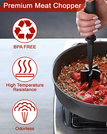 Premium And Safe Material: Our ground meat masher is made of very solid nylon material, BPA free, non-stick, odorless, and with a high temperature resistance up to 447℉; It is safe to use on all types of cookware including non stick and coated.