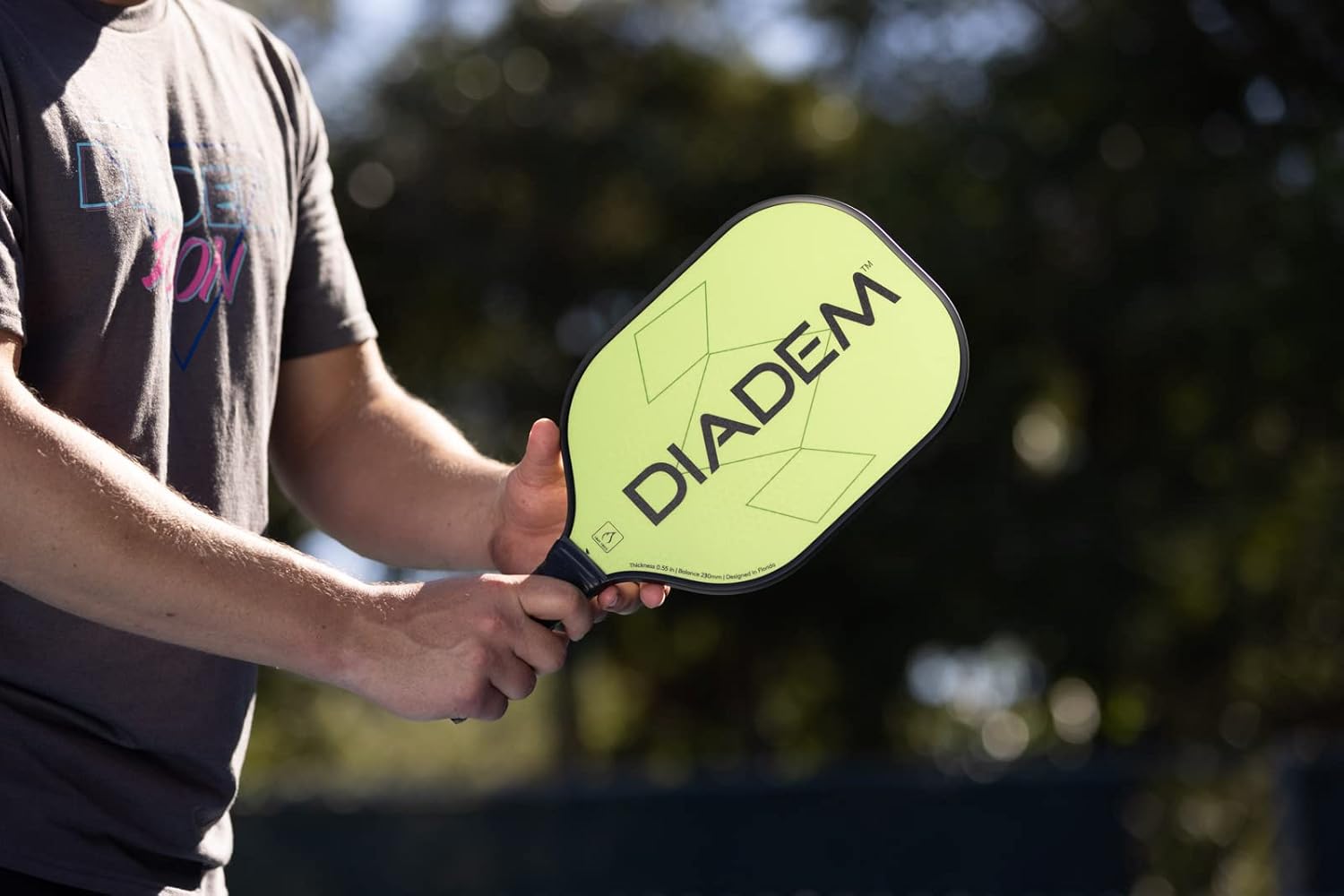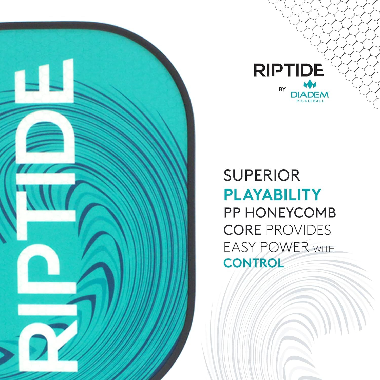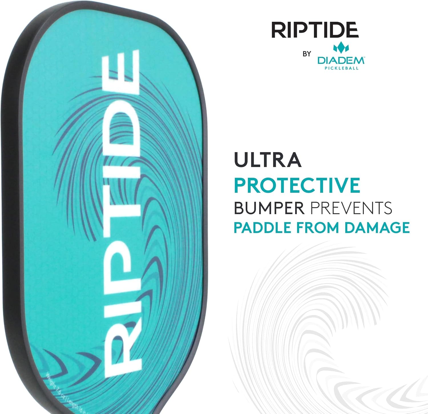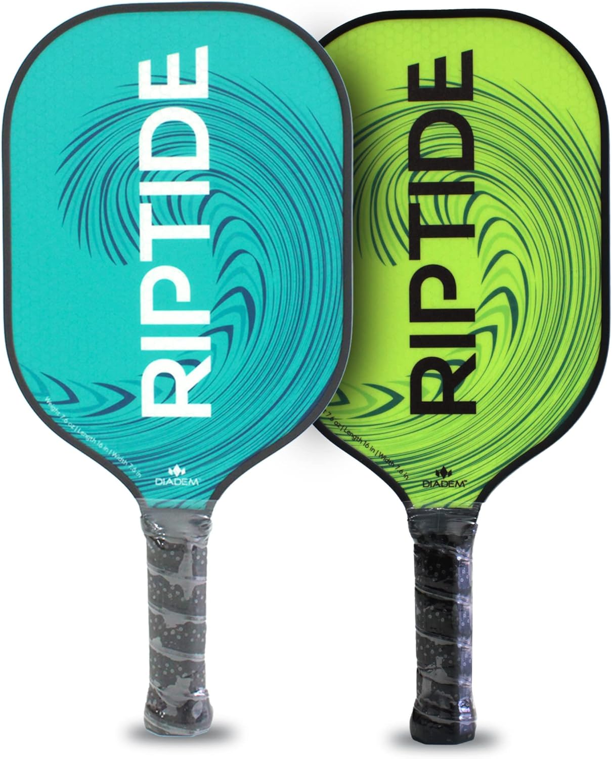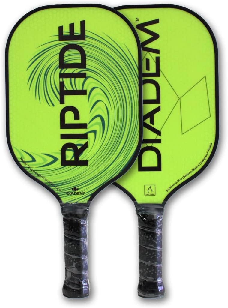 The DIADEM RIPTIDE PADDLE is the perfect option for the serious pickleball player not looking to break the bank! Perfectly balanced and easy to swing, you will be able to enjoy the game of pickleball right away. Choose between the true Diadem teal, or the electric yellow. The Riptide paddle uses HMT Fiber, a blend of hot melt glass fiber to give power to your baseline strokes and put away as well as a rough surface to get added spin. The thick bumper prevents any scratches to the paddle surface as you learn the dos and don’ts of the game. A .55in/14mm thickness with an 8mm honeycomb cell interior structure mimics our high-end Icon paddles for added power. The next pickleball champion starts here.