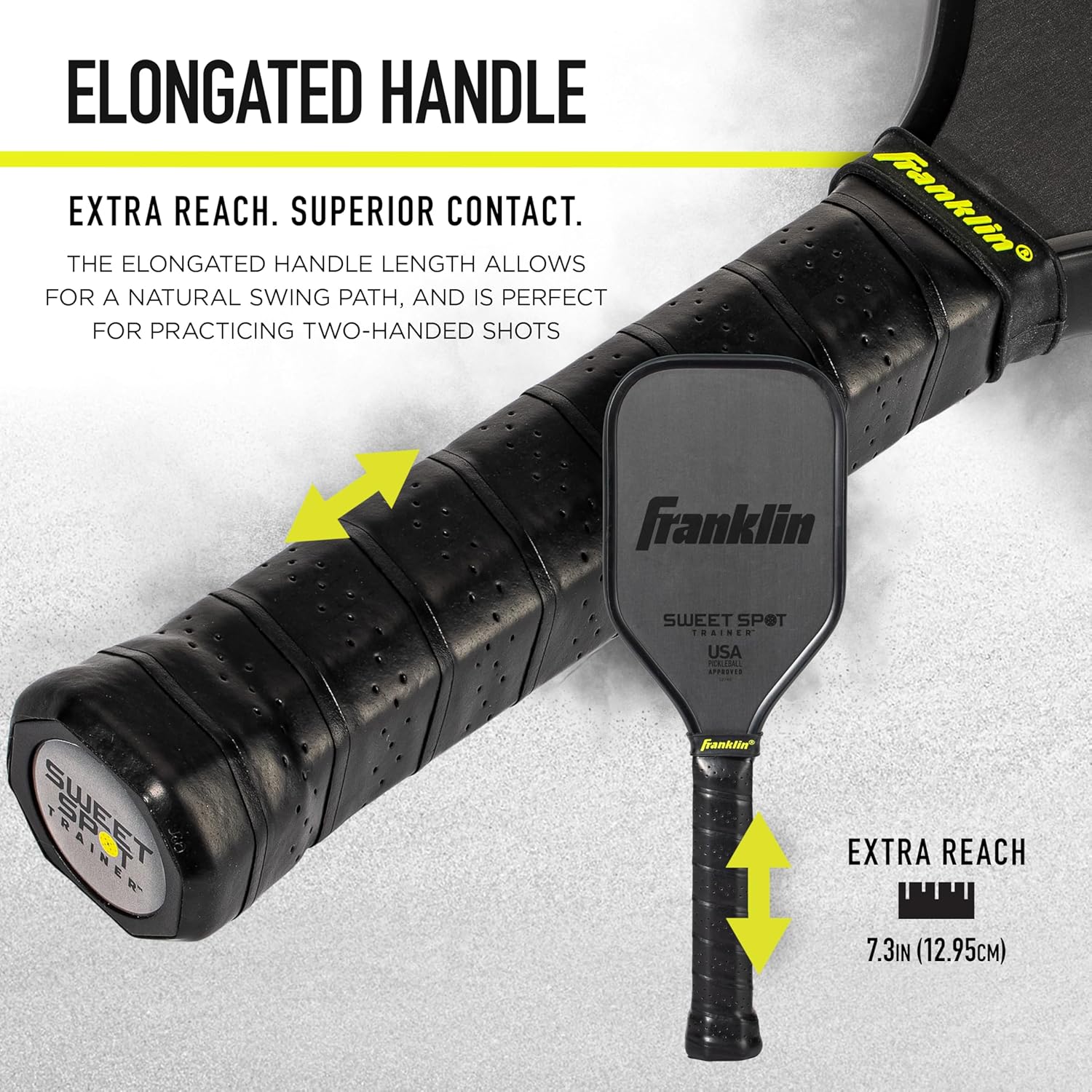 ELONGATED HANDLE: The elongated handle helps players preserve their natural swing path with the smaller paddle head and also allows players to easily practice making two handed shots