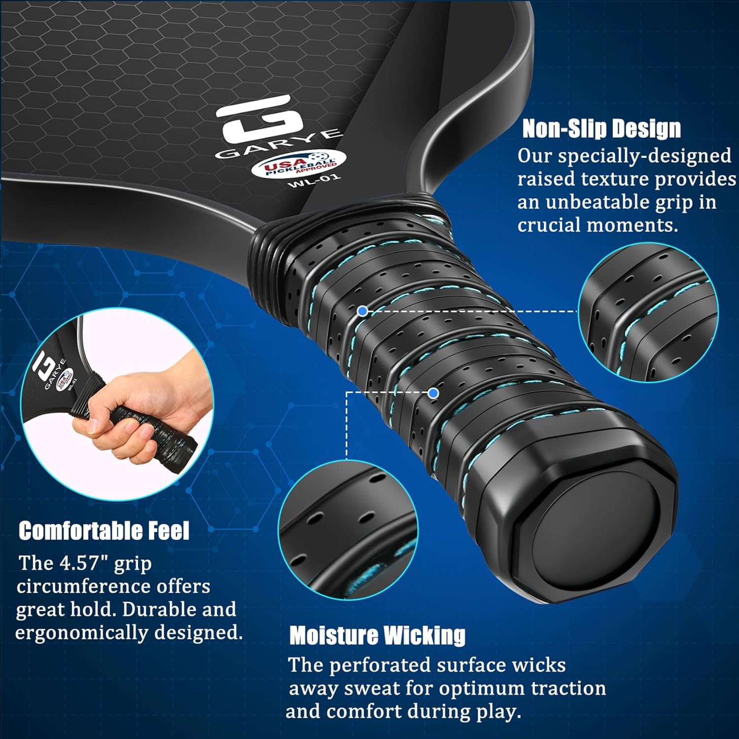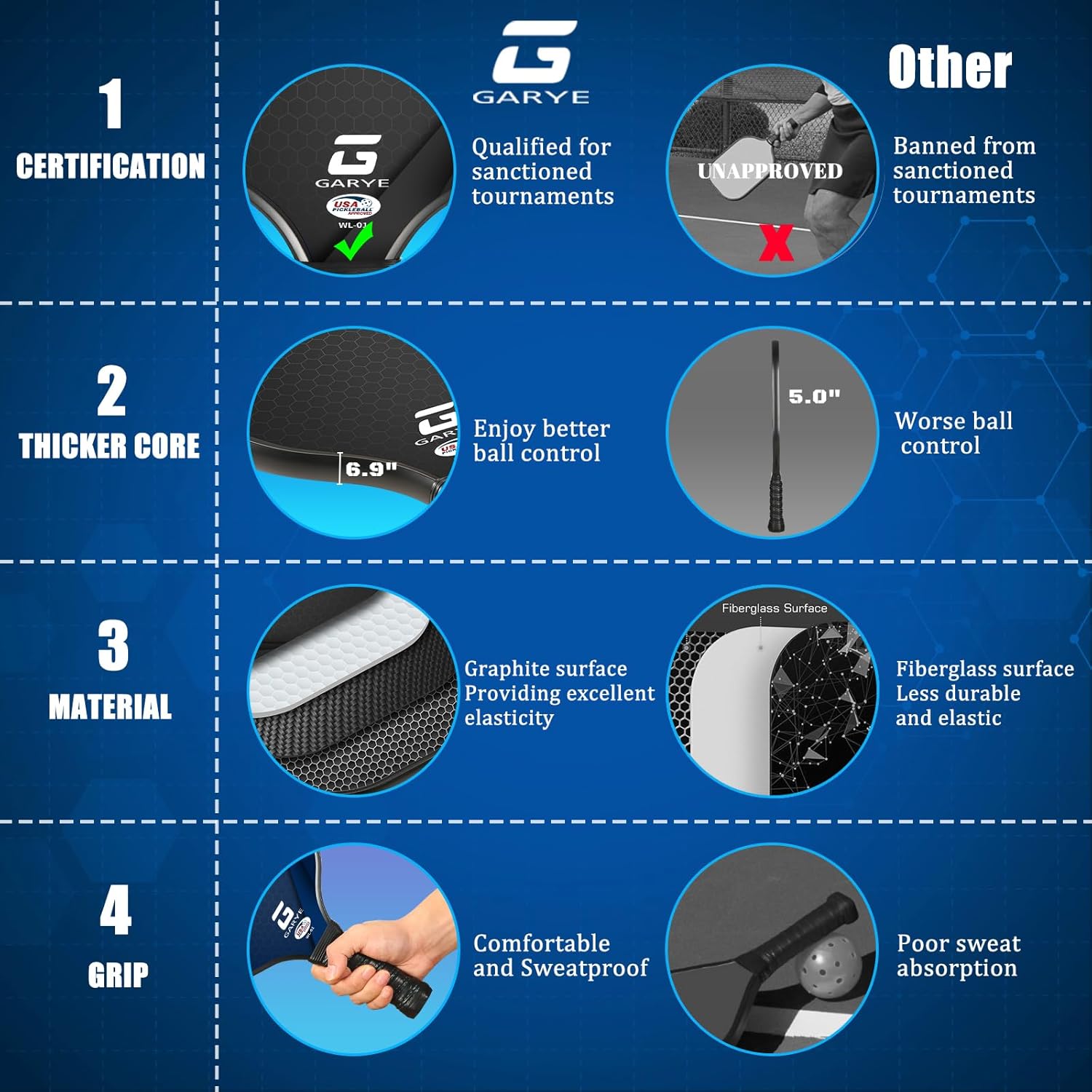 【USAPA Approved】GARYE WL-01 pickleball paddles are tested and approved by the USAPA for tournament play and international pickleball events. Each pickle ball paddle in the GARYE WL-01 series is manufactured strictly according to USAPA standards, and carries a USAPA approval label. You can find further details on the USA Pickleball website.