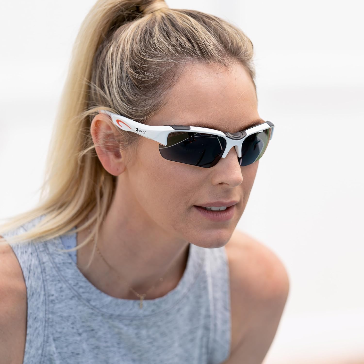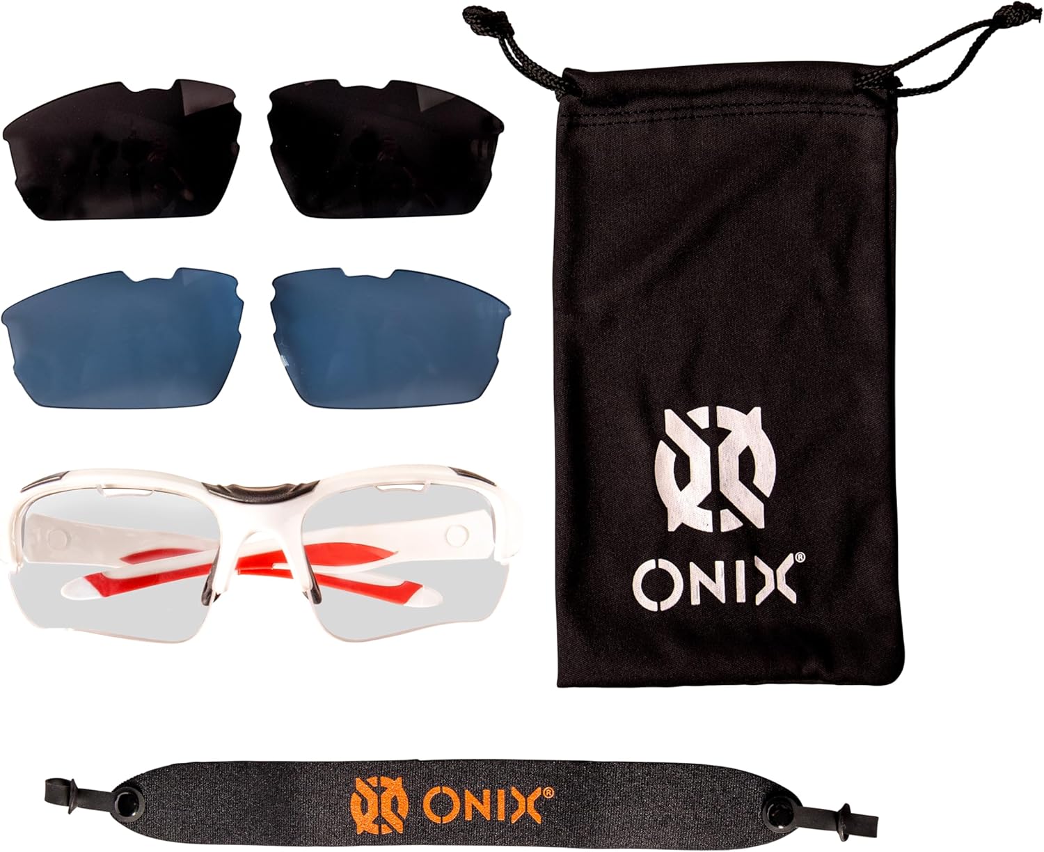 The ONIX Pickleball Falcon Eyewear safety glasses are built to withstand the rigors of competitive pickleball play and keep players safe. The glasses feature 99.9% UV sun protected and durable anti-scratch/anti-fog treated lenses. The set includes three lenses color options — clear, smoke, and blue tint. Soft non-slip nose pieces add comfort and the soft ear pads provide a secure fit while you play. The Falcon Eyewear protective safety glasses also include an adjustable elastic strap and a microfiber storage pouch. Lenses: Polycarbonate material; Frames: Nylon material; Nose piece & side arm padding: TRP/ Rubber. All eyewear models meet/exceed ASTM F803-11 impact standard. Dimensions: lens width – 6.7cm, lens height – 3.7cm, temple length – 11.5cm, overall width – 14.7cm.