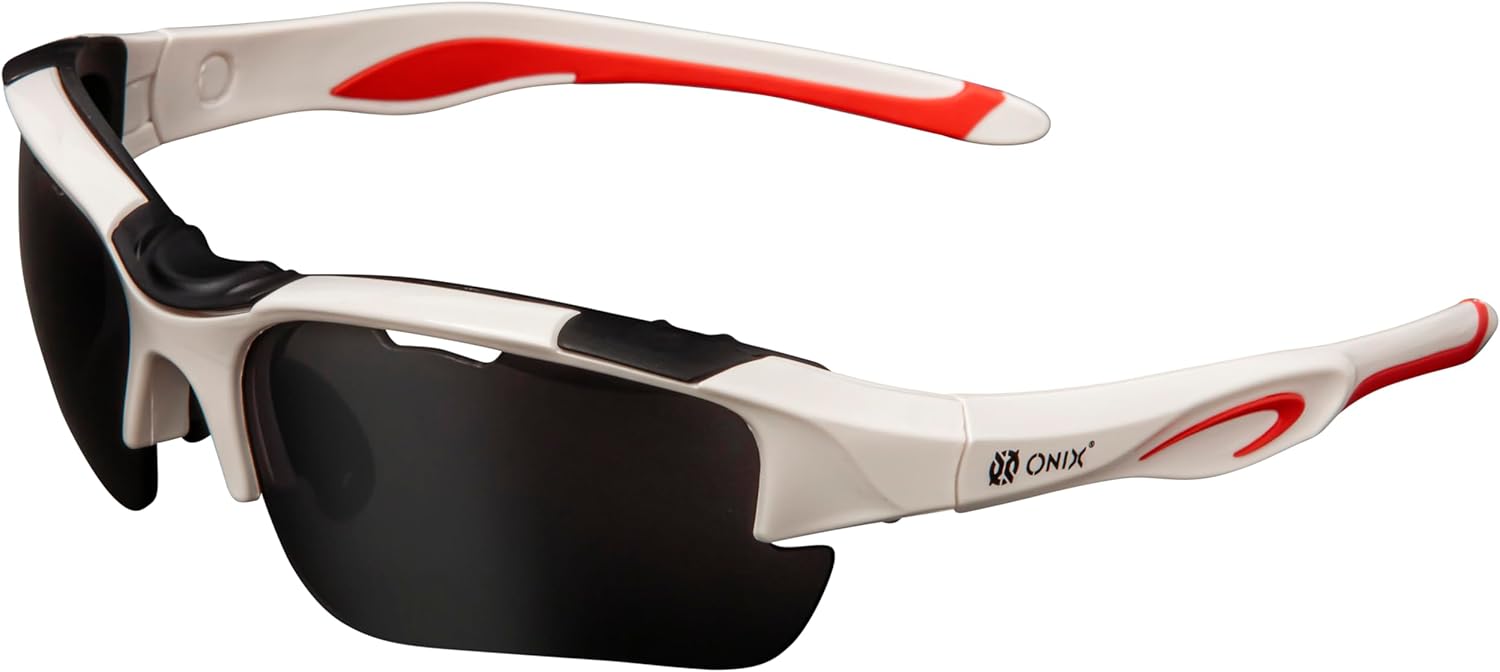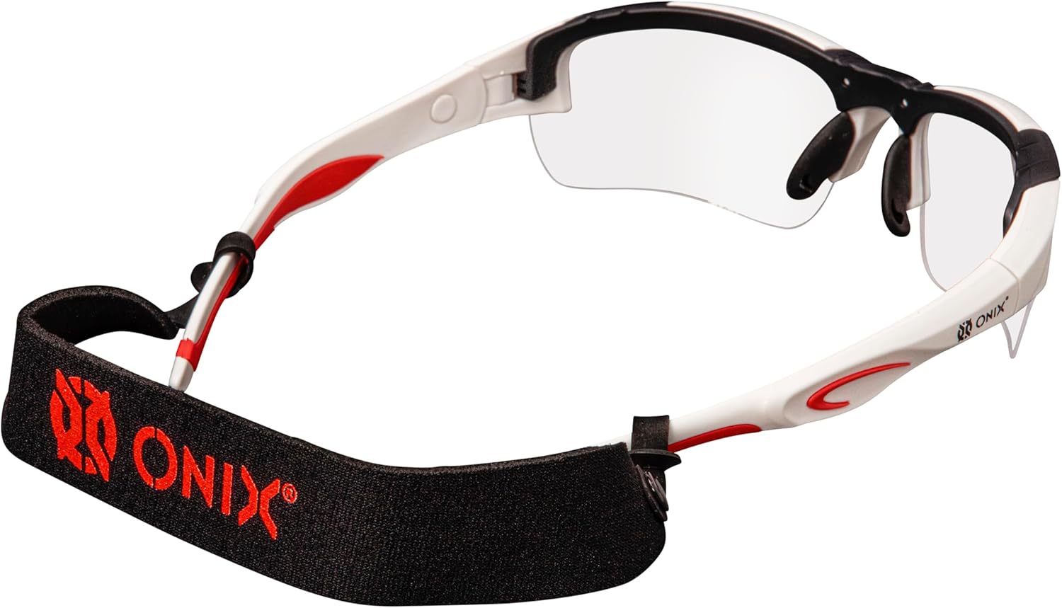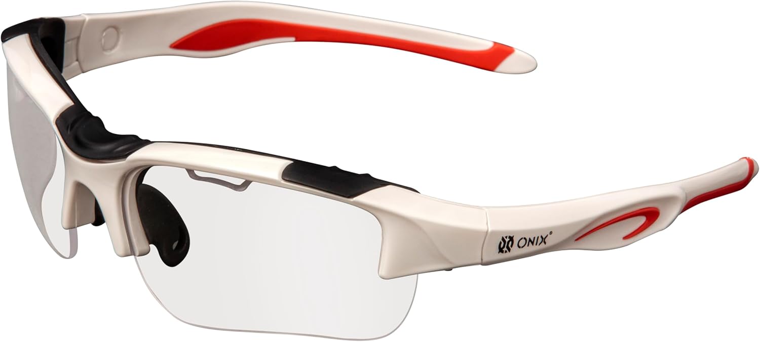 The ONIX Pickleball Falcon Eyewear safety glasses are built to withstand the rigors of competitive pickleball play and keep players safe. The glasses feature 99.9% UV sun protected and durable anti-scratch/anti-fog treated lenses. The set includes three lenses color options — clear, smoke, and blue tint. Soft non-slip nose pieces add comfort and the soft ear pads provide a secure fit while you play. The Falcon Eyewear protective safety glasses also include an adjustable elastic strap and a microfiber storage pouch. Lenses: Polycarbonate material; Frames: Nylon material; Nose piece & side arm padding: TRP/ Rubber. All eyewear models meet/exceed ASTM F803-11 impact standard. Dimensions: lens width – 6.7cm, lens height – 3.7cm, temple length – 11.5cm, overall width – 14.7cm.