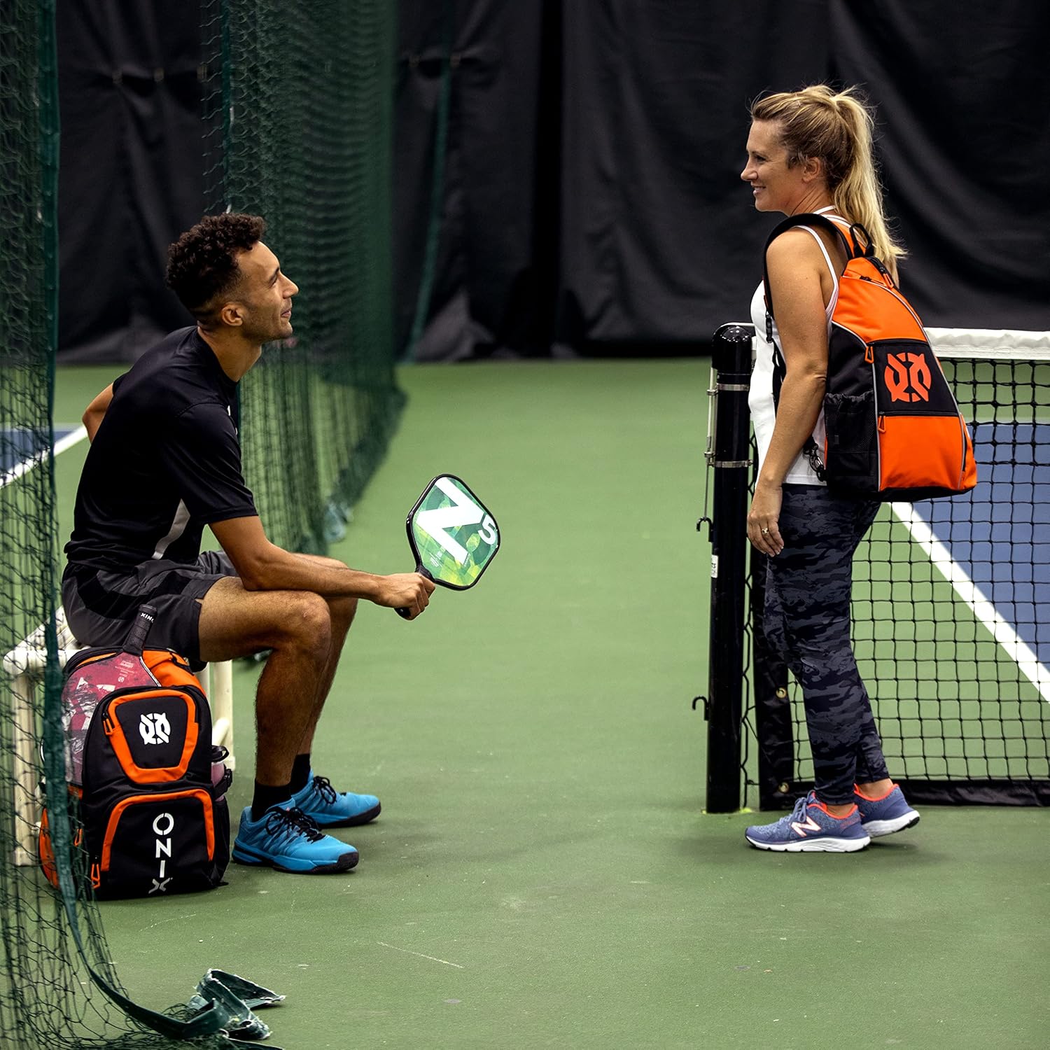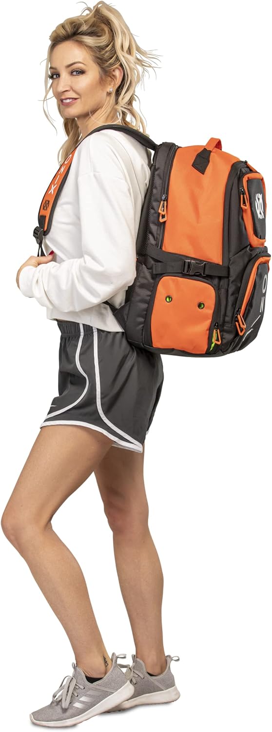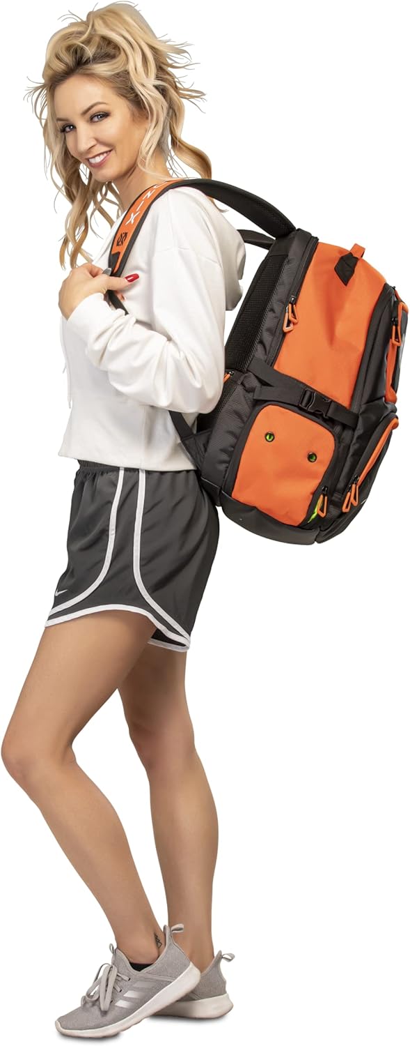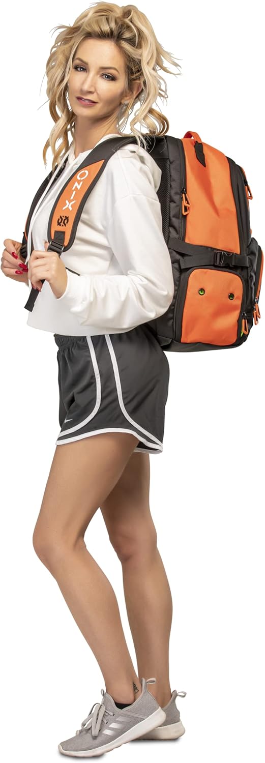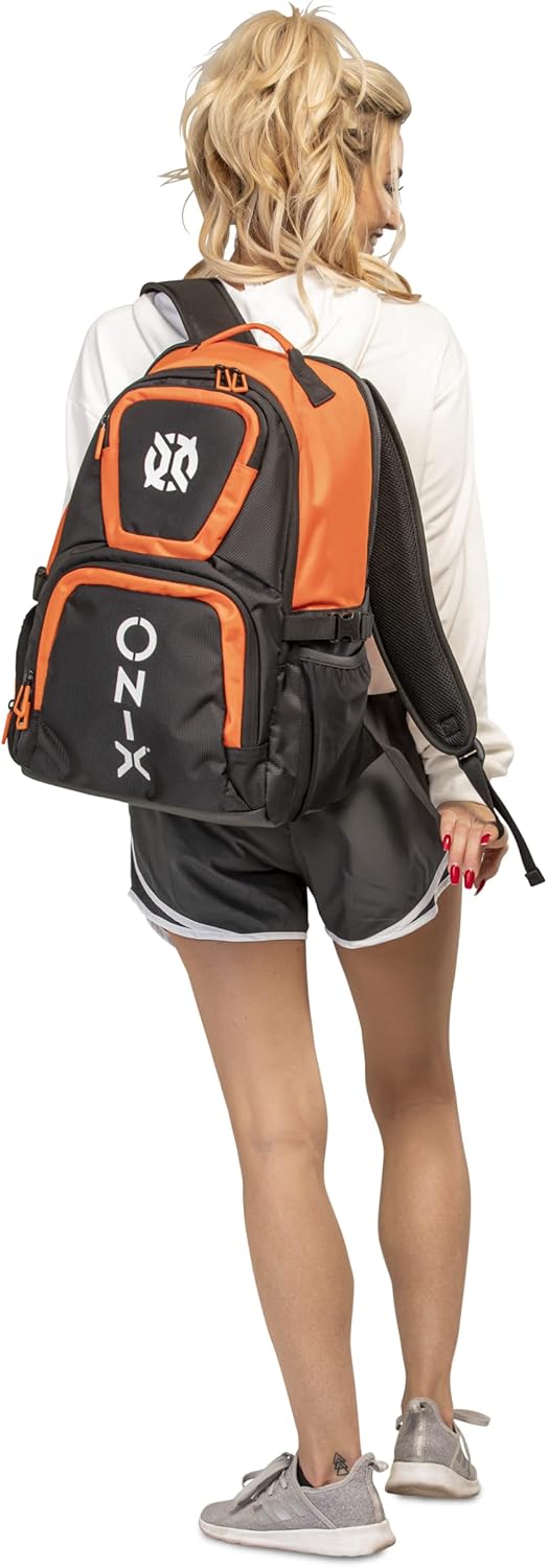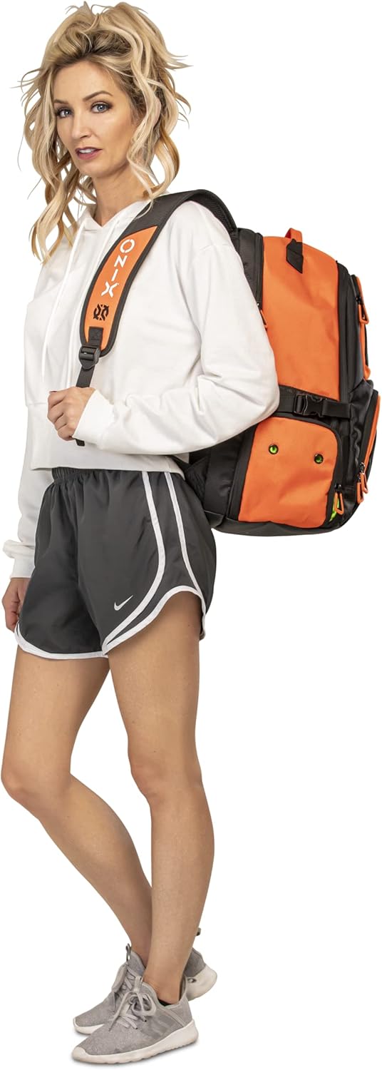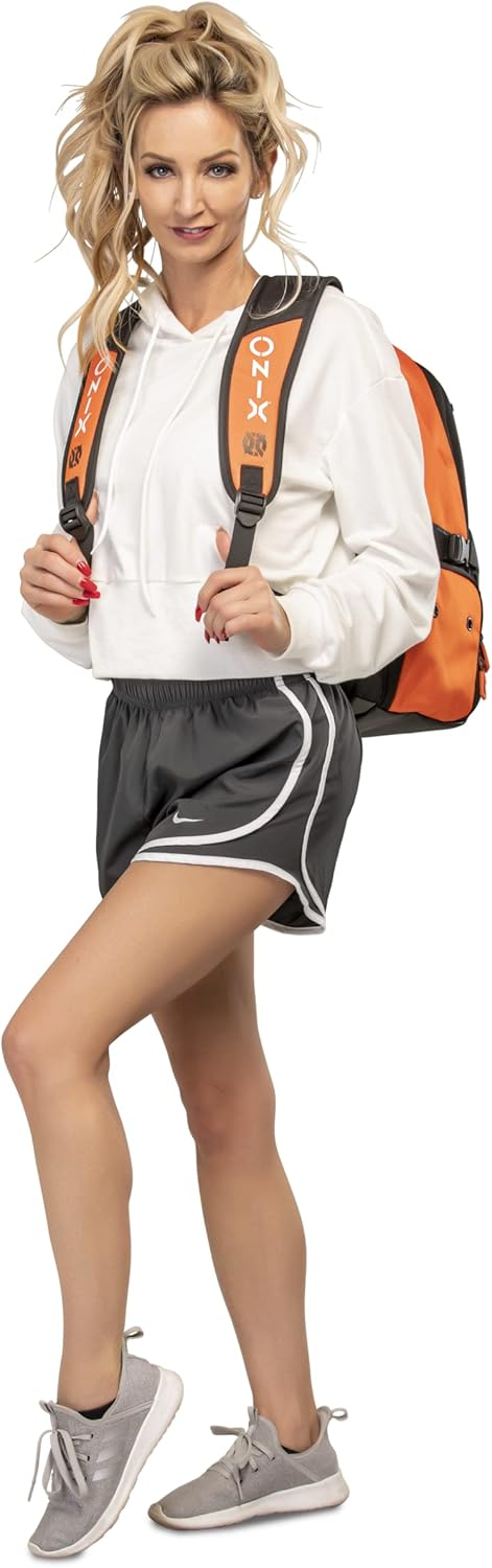 The ONIX Pickleball Pro Team Backpack is perfect for a day at the pickleball courts. The durable polyester bag withstands tough abuse and features four zippered pockets including a shoe/wet storage compartment. This pickleball backpack also offers a padded paddle compartment to keep your paddles safe and secure. Easily carry the pickleball backpack with you using the hook and loop closure or with the padded shoulder straps. Choose between two color options — orange and black and white and black. Measuring 19” L x 14” W x 9” H, ONIX Pickleball has designed a pickleball backpack specifically for your pickleball playing needs to help you perform even better.