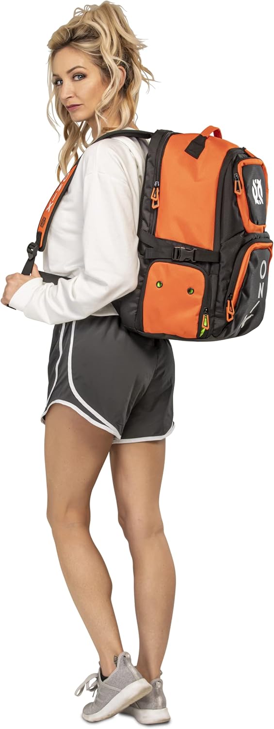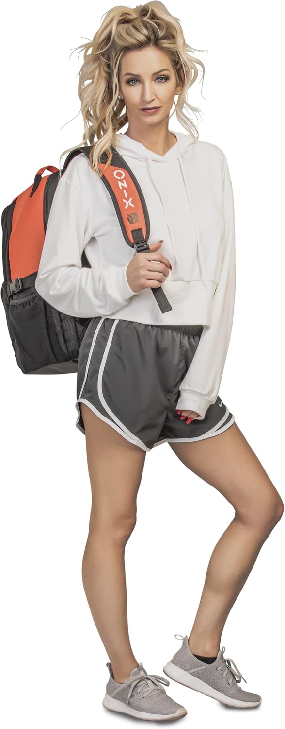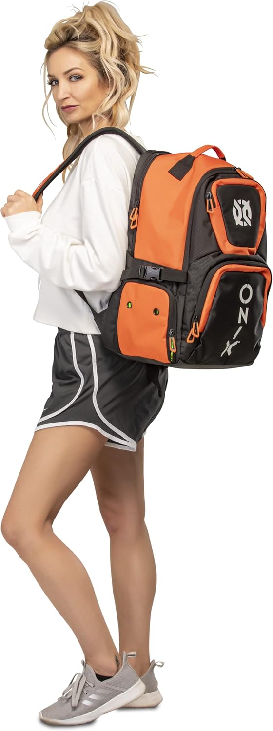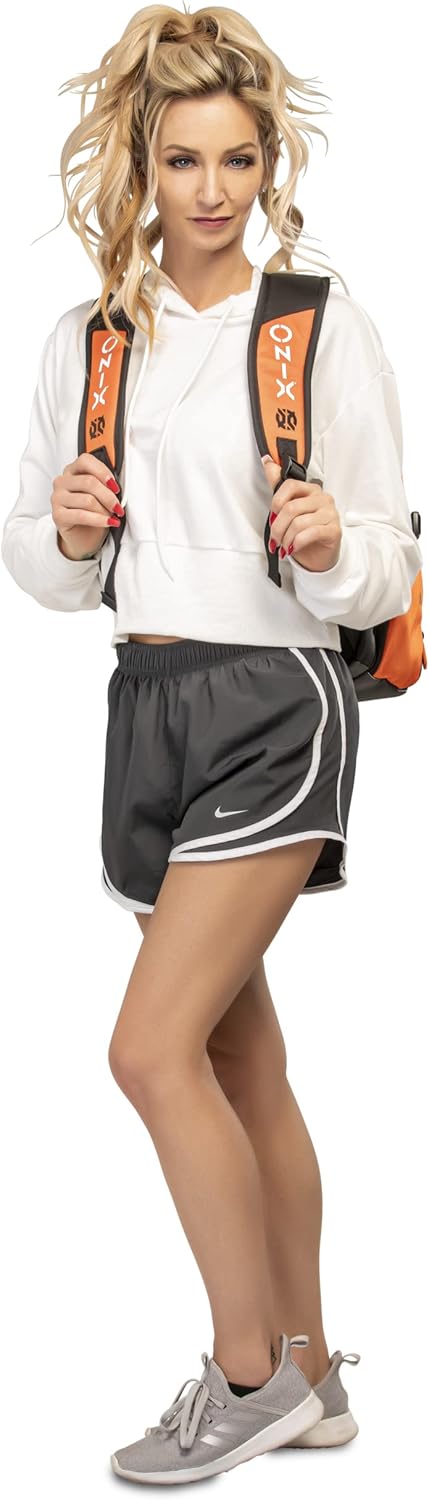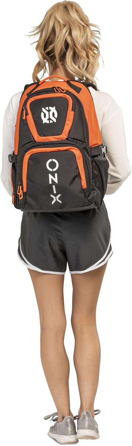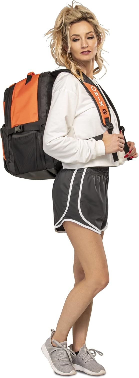 The ONIX Pickleball Pro Team Backpack is perfect for a day at the pickleball courts. The durable polyester bag withstands tough abuse and features four zippered pockets including a shoe/wet storage compartment. This pickleball backpack also offers a padded paddle compartment to keep your paddles safe and secure. Easily carry the pickleball backpack with you using the hook and loop closure or with the padded shoulder straps. Choose between two color options — orange and black and white and black. Measuring 19” L x 14” W x 9” H, ONIX Pickleball has designed a pickleball backpack specifically for your pickleball playing needs to help you perform even better.