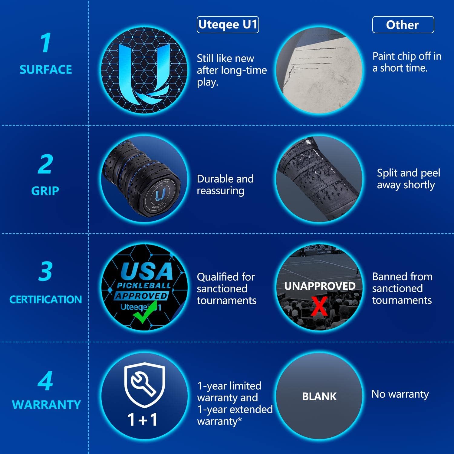 Unlike some pickleball paddles that chip off soon, Uteeqe U1 has adopted a proprietary surface crafting that is more durable and last much longer.