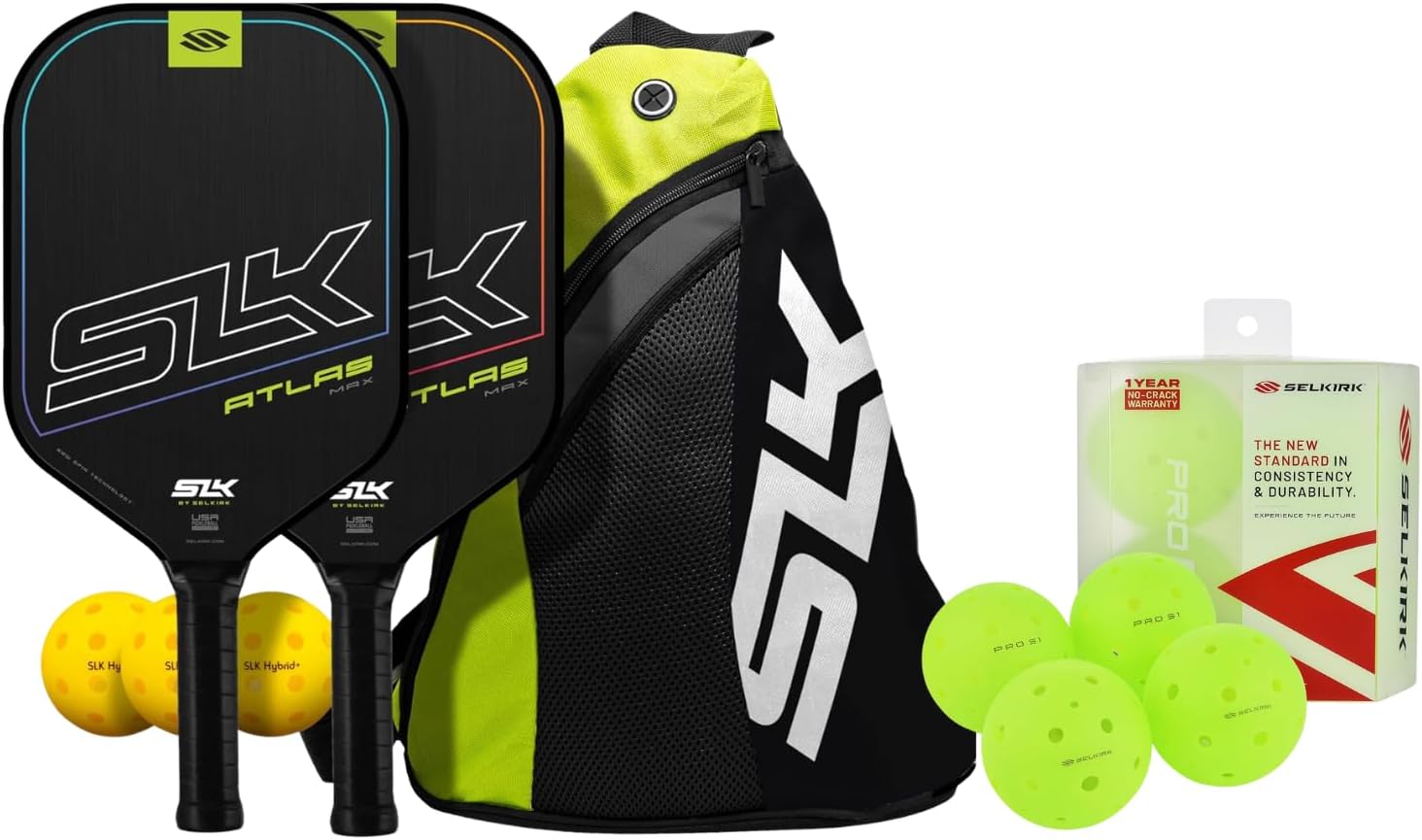 【RAW CARBON PICKLEBALL PADDLE SET】 At Selkirk, we are committed to delivering paddles that elevate your game, no matter your skill level. The SLK Atlas Max Bundle brings together cutting-edge technology with unbeatable value, featuring a Raw Carbon Fiber Face that offers exceptional control and spin. Designed for players looking to enhance their accuracy and power, this set is ideal for those ready to elevate their game.