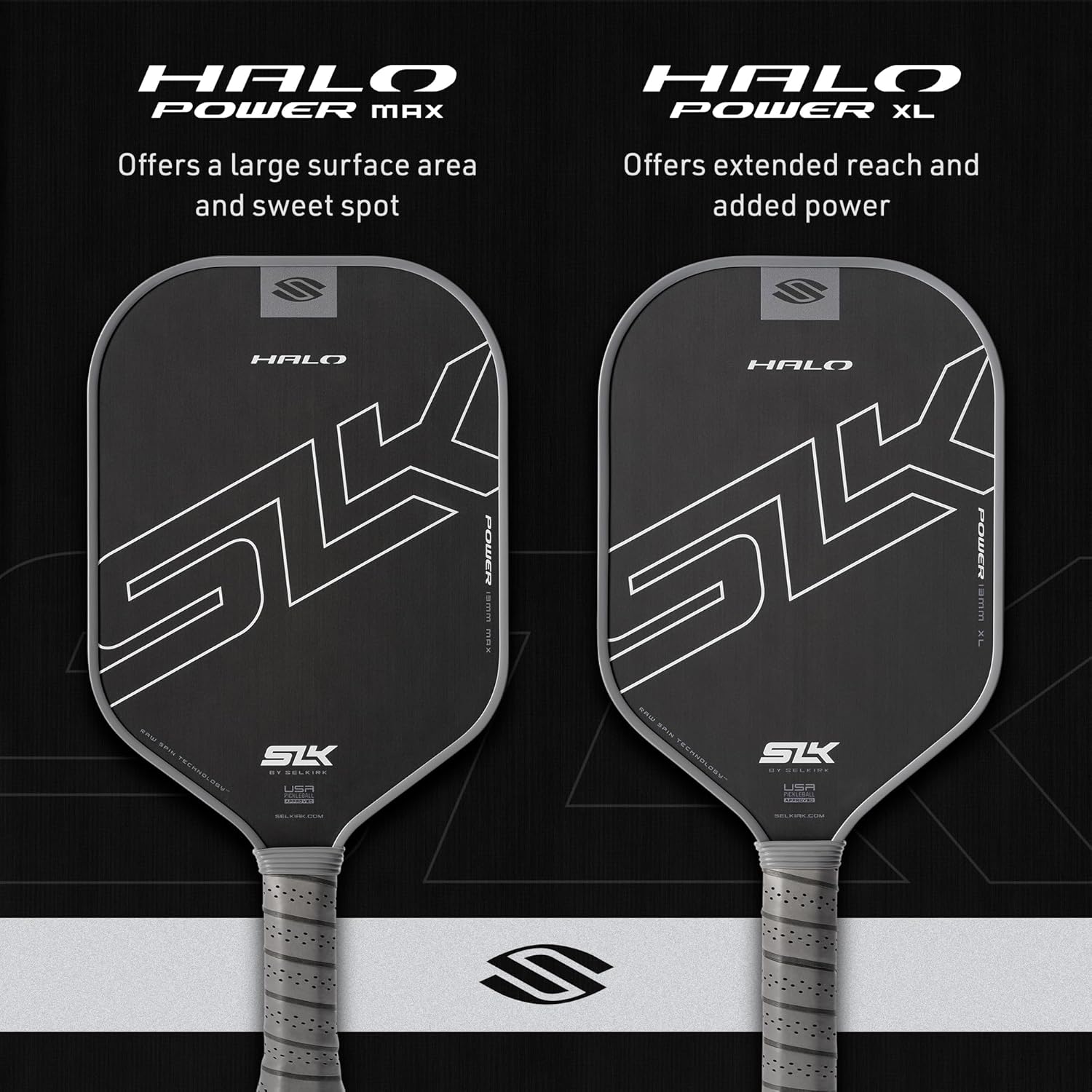 【 SPECS 】 The Selkirk SLK Halo Power XL Pickleball Paddle Weight Range: 7.5 – 8.0 oz., Length: MAX – 16″, Width: MAX – 7.85″, Face: T700 Raw Carbon Fiber, Grip Circumference: 4.0″, Grip: SLK Faux Leather Grip, Handle Length: MAX – 4.85″, Core: Rev-Core Power Polymer Core