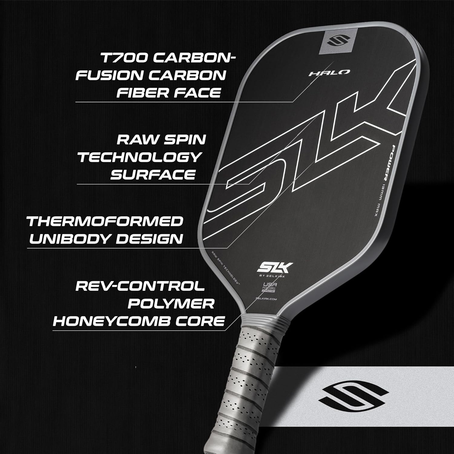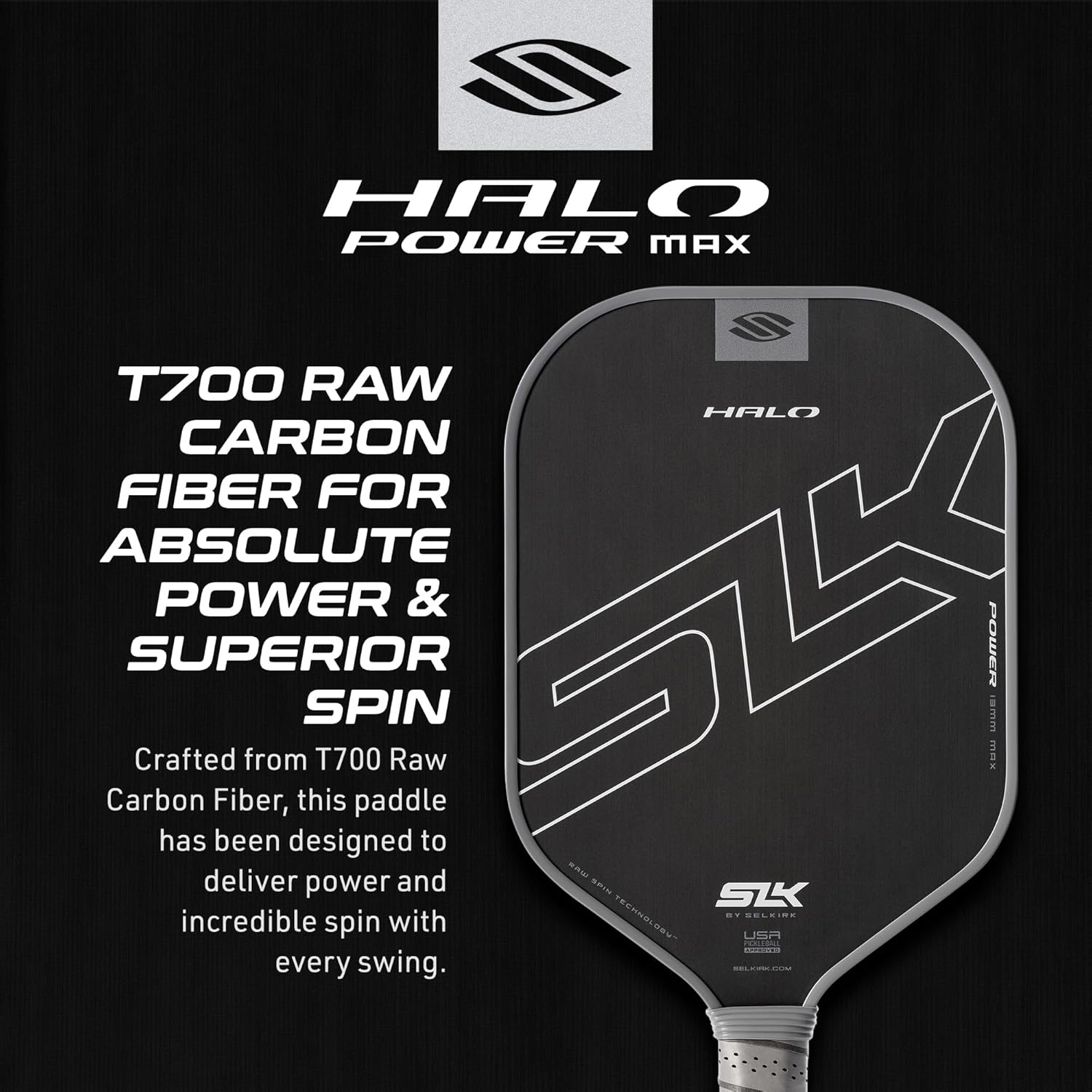 【 RAW CARBON FIBER PICKLEBALL PADDLE 】The SLK Halo Control MAX Carbon Fiber Pickleball Paddle is developed to dominate the game, utilizing a T700 Raw Carbon Fiber Face featuring Raw Spin Technology. This provides unmatched control and spin off the paddle face, making it the perfect paddle for both beginners and pros alike.